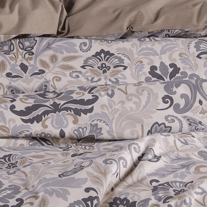 Елегантен класически дизайн, съчетаващ нежни флорални орнаменти в тонове сиво, графитено и бежово. Меките цветове и изисканите фигури създават луксозно усещане и пренасят спалнята в спокойна, модерна и балансирана атмосфера.