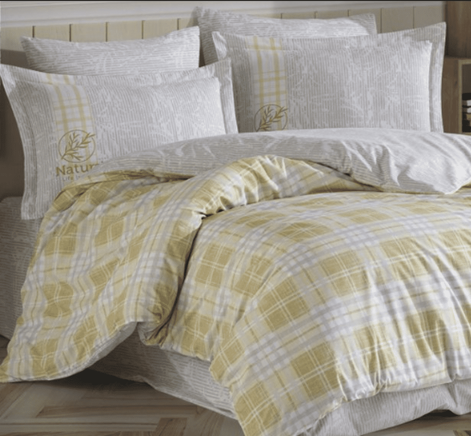 Двулицевият плик предлага възможност за разнообразие – едната страна е в модерна жълта каре шарка, която придава топлина и енергия на интериора, а другата е в елегантен сив дизайн с деликатни линии. Калъфките са в същия стил, с изчистен и хармоничен десен, който допълва цялостната визия.