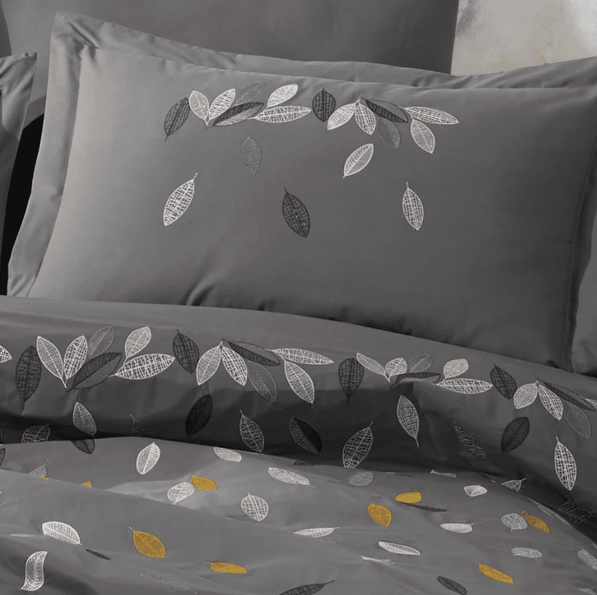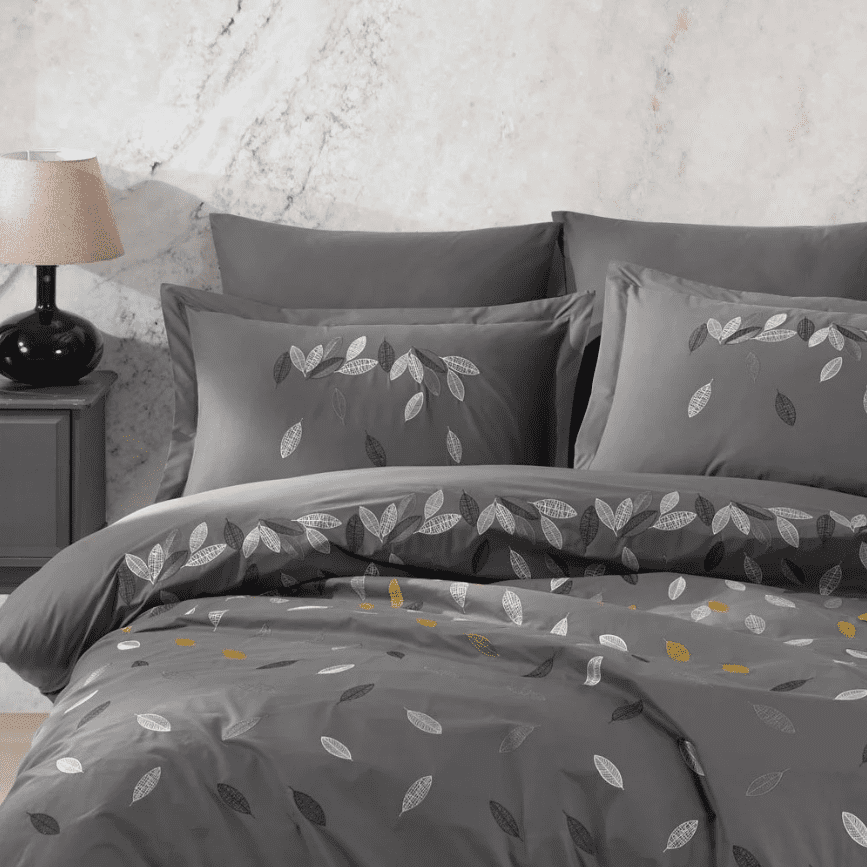 Деликатната бродерия от фини листа в сиво, бяло и златисто се откроява върху дълбок графитен фон, придавайки усещане за стил и уют. Изчистеният дизайн и класическата гама цветове го правят подходящ за модерни и минималистични интериори.