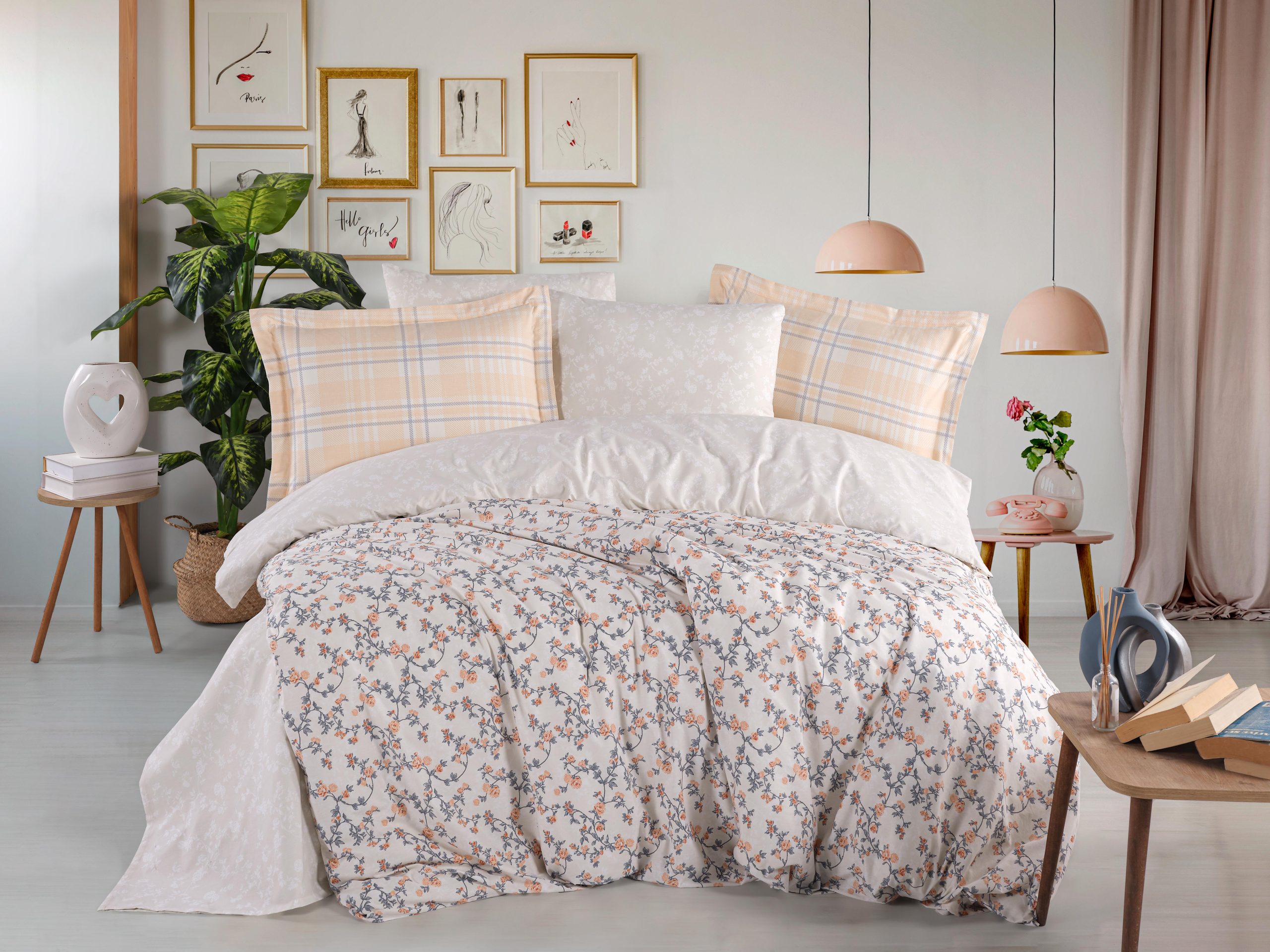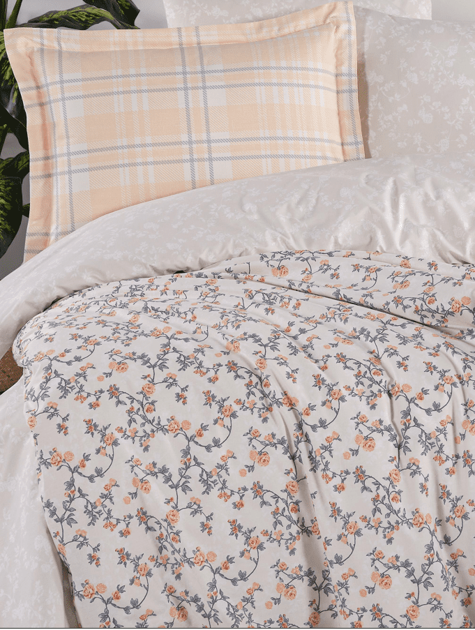 Калъфките са акцент в комплекта – едната страна е със стилна каре шарка в кремаво и бледо сиво, която внася модерно звучене и визуален баланс. Тази комбинация между флорално и каре придава свежест, подчертава индивидуалност и добавя характер към интериора.