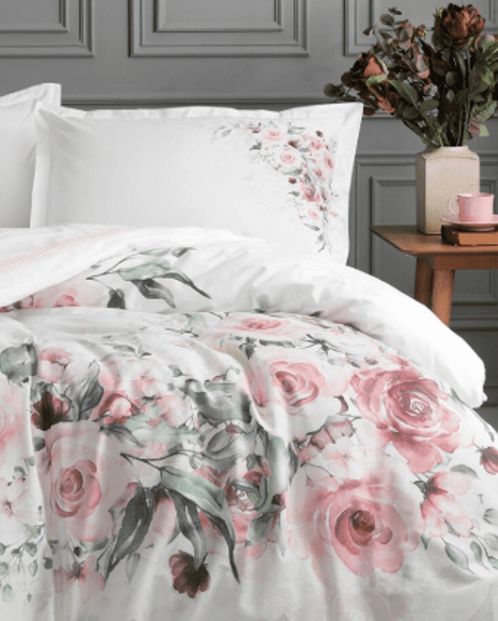 Потопете се в магията на деликатната романтика с този изключително фин спален комплект от 100% памук ранфорс. Белият фон е като чисто платно, върху което разцъфват ръчно вдъхновени флорални мотиви – нежни рози в нюанси на розово и бордо, обгърнати от свежи зелени листа. Десенът създава усещане за утринна градина, събудена от първите лъчи на слънцето.