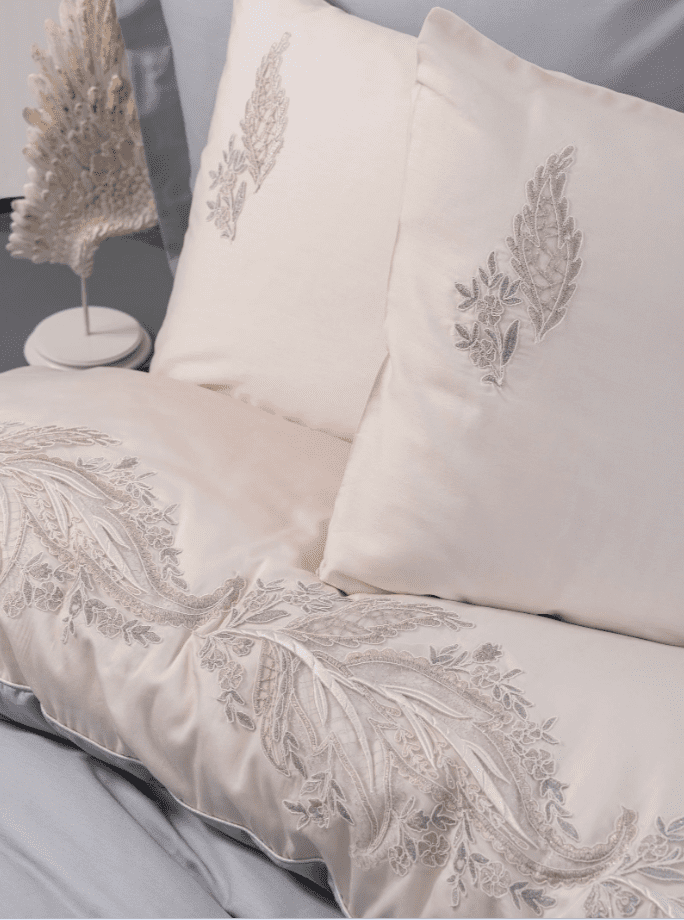 Комплектът включва плик за завивка с размери 200х220 см, украсен с изискана дантелена бродерия в деликатни сребристо-бежови нюанси. Фините флорални мотиви се преплитат по текстила като изкуство, придавайки му характер на истинско дизайнерско бижу. От едната страна пликът е с богата орнаментика, докато другата е в изчистен тон за повече универсалност.