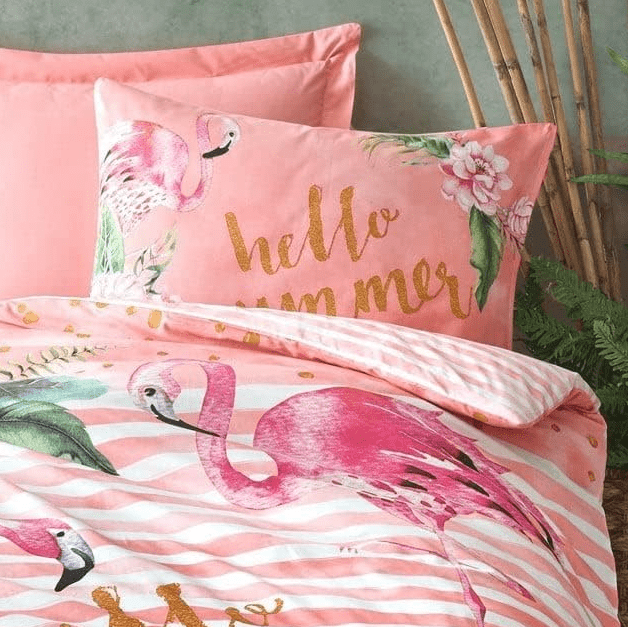 Очарователният десен с фламинго, златисти акценти и надпис „Hello Summer“ ще внесе топлина и позитивна енергия в стаята.