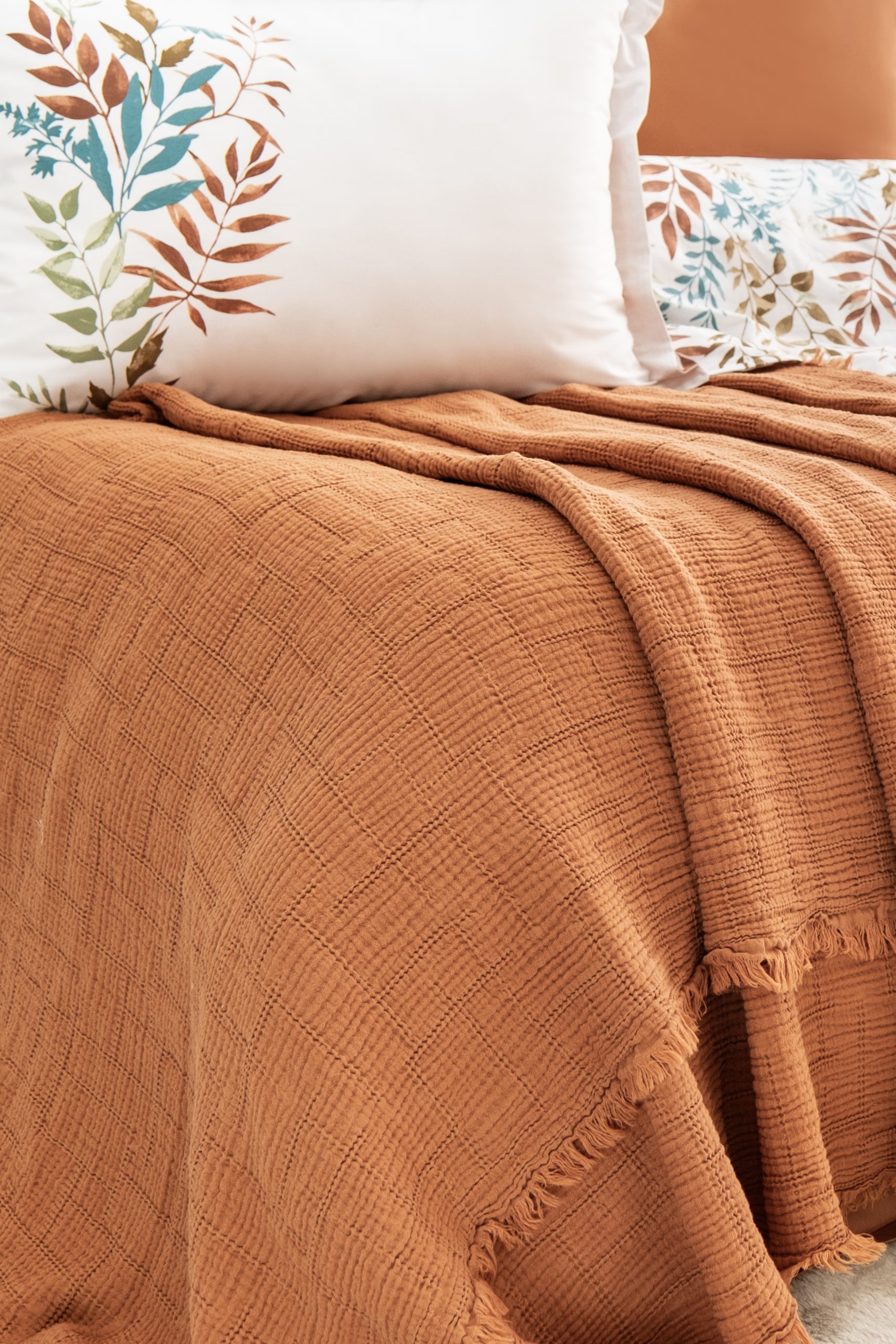 Покривалото от муселин е в приглушен теракотов нюанс с фини ресни и релефна текстура, придаваща естествен обем и артистичност.